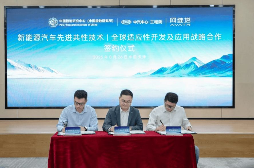在天津中汽中心總部,阿維塔科技(重慶)有限公司、中汽中心工程院與中國極地研究中心(中國極地研究所)共同宣布了一項重大合作——啟動新能源汽車先進共性技術的全球適應性開發及應用戰略合作。這一合作標志著三方將攜手建立“新能源汽車先進共性技術全球適應性開發及應用創新基地”,旨在推動全球新能源汽車共性技術的突破與發展。