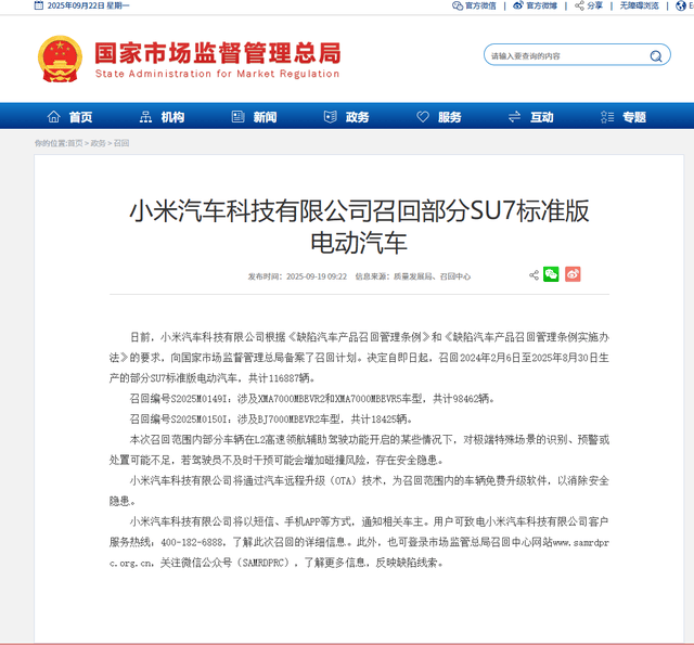 國家市場監(jiān)督管理總局近日披露,小米汽車已正式提交召回計劃,涉及2024年2月6日至2025年8月30日期間生產(chǎn)的116,887輛SU7標(biāo)準(zhǔn)版電動車。此次召回依據(jù)《缺陷汽車產(chǎn)品召回管理條例》及其實施辦法執(zhí)行,與以往車企主動發(fā)起召回不同,本次事件源于監(jiān)管部門對車輛安全缺陷的調(diào)查。