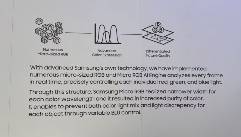 但三星的 Micro RGB 技術顯然走得更遠。其核心突破在于將紅、綠、藍三色 LED 燈珠壓縮至 100 微米以下,并以精密陣列排布成背光系統,這一尺寸已達到 Micro LED 水準,也是目前 RGB LED 背光方案中最小的發光芯片。這種技術命名并非噱頭 —— 三星早已實現 Micro LED 直顯產品的量產,如今不過是將成熟的微米級 LED 控制技術平移至背光領域,技術銜接自然流暢,不存在實質性壁壘。