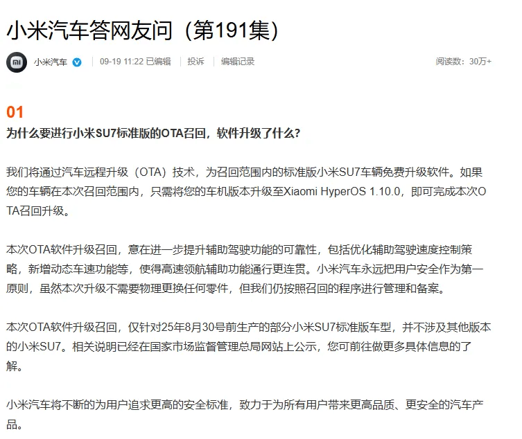?小米召回超11萬輛SU7標準版,雷軍轉發官方回應,將OTA升級增新功能?
