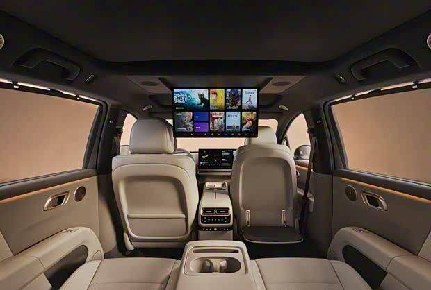 內飾設計凸顯科技與舒適融合理念,后排配備的21.4英寸吸頂折疊屏成為最大亮點。該配置或采用差異化策略,未配備屏幕的版本將升級為全景天幕搭配電動遮陽簾。車門飾板延續i8家族語言,金屬質感揚聲器與環繞式氛圍燈營造豪華氛圍,寬大扶手提升觸感體驗。中央扶手區域集成冷暖雙用冰箱,副駕座椅前移功能與右后座專屬腳托形成"老板座"組合,配合專屬頭枕靠墊與手動側窗遮陽簾,構建移動商務艙級乘坐體驗。