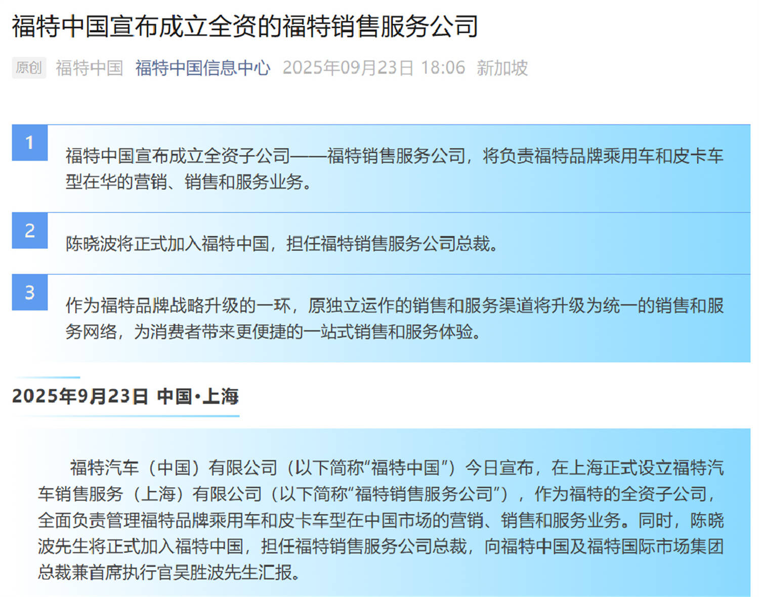 此次變革直指合資車(chē)企長(zhǎng)期存在的渠道痛點(diǎn)。過(guò)去,長(zhǎng)安福特、江鈴福特及進(jìn)口車(chē)業(yè)務(wù)采用并行銷(xiāo)售模式,導(dǎo)致資源分散、品牌形象割裂。新成立的全資子公司將打破這一局面,通過(guò)"一個(gè)福特"戰(zhàn)略實(shí)現(xiàn)品牌協(xié)同,從財(cái)務(wù)結(jié)算到渠道管理進(jìn)行全面整合。值得注意的是,該公司由林肯汽車(chē)銷(xiāo)售服務(wù)(上海)有限公司更名而來(lái),2025年起林肯品牌財(cái)務(wù)體系已率先并入福特中國(guó),為本次調(diào)整奠定基礎(chǔ)。