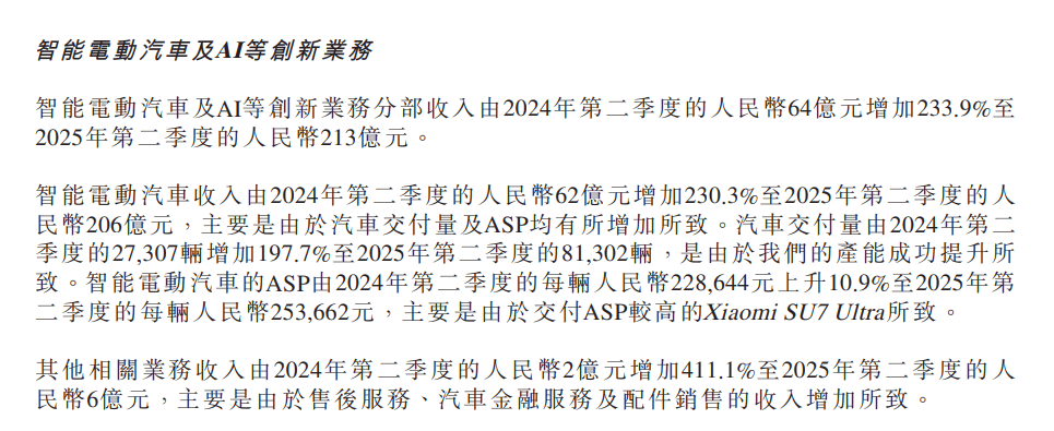 智能電動汽車業務成為財報亮點。該板塊收入從2024年第二季度的64億元躍升至2025年同期的213億元,增幅達233.9%。其中,汽車業務收入從62億元增至206億元,主要得益于交付量與單車均價(ASP)的雙重提升。