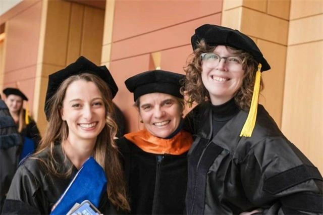 卡洛琳·盧格教授(中)與她的兩位博士學生在畢業典禮上的合影
