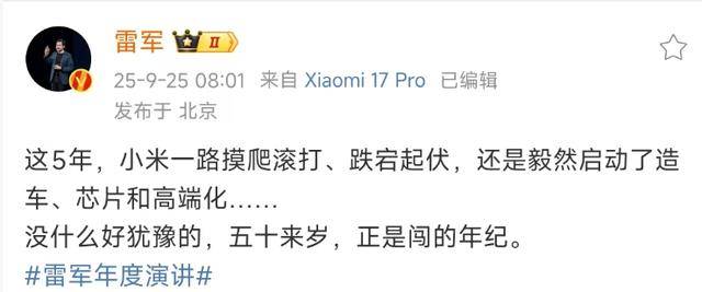 小米集團董事長兼CEO雷軍近日在社交平臺發文,回顧小米近五年來的發展歷程。他提到,這五年間小米經歷了諸多波折,但仍堅定地推進造車、芯片研發和高端化戰略。雷軍表示:“五十來歲,正是闖的年紀。”