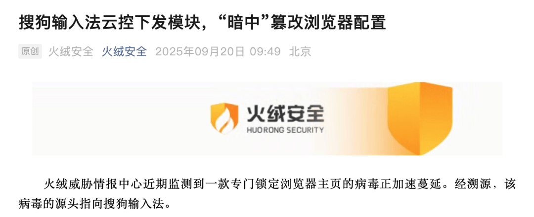 近日,安全軟件公司火絨安全在官方微信公眾號發(fā)布文章,指出搜狗輸入法存在通過云控模塊“暗中”修改瀏覽器配置的嫌疑。據(jù)火絨威脅情報(bào)中心監(jiān)測,一款以鎖定瀏覽器主頁為目標(biāo)的病毒正在快速擴(kuò)散,經(jīng)溯源分析,該病毒與搜狗輸入法的云控功能存在關(guān)聯(lián)。