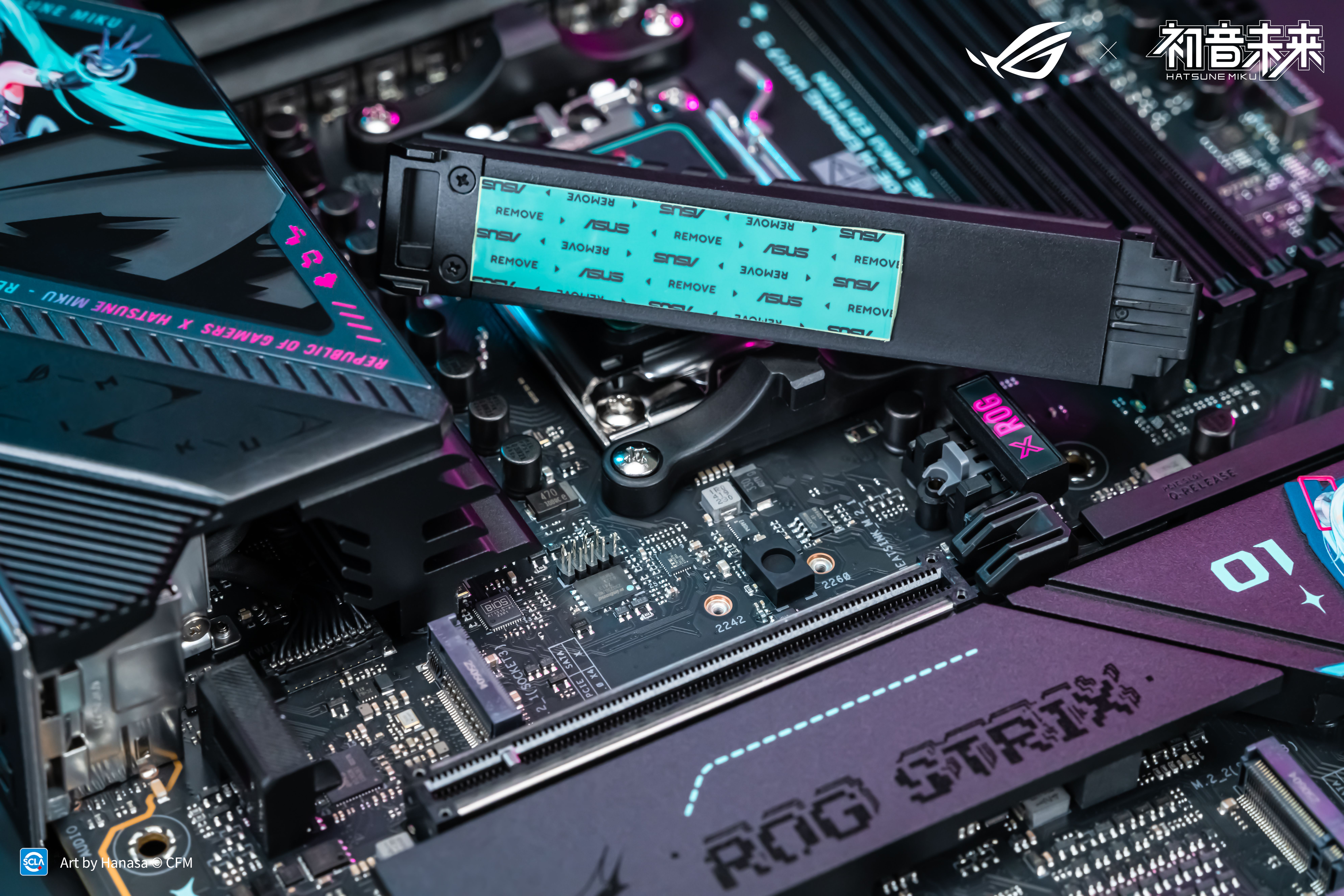 ROG X870E RO姬×初音未來版主板板載2個(gè)PCIe 5.0 M.2接口和2個(gè)PCIe 4.0 M.2接口,均配備高效散熱片,有效降低M.2 SSD的溫度,保障高速運(yùn)行與游戲加載流暢。還有M.2快拆裝甲和M.2便捷卡扣2.0,免工具裝卸SSD。支持PCIe 5.0規(guī)格顯卡,主插槽更加入顯卡易拆鍵,一鍵即可輕松拆下顯卡,升級或維護(hù)顯卡更方便。