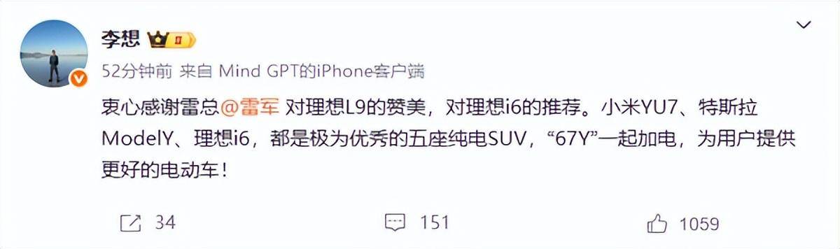 這番言論很快得到了理想汽車創(chuàng)始人李想的回應(yīng)。李想通過社交媒體表示:"非常感激雷總對理想L9的肯定,以及對理想i6的推薦。"他進一步指出,小米YU7、特斯拉Model Y和理想i6這三款五座純電SUV代表了當前市場的最高水平,期待它們能共同推動電動車行業(yè)的發(fā)展。