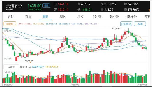 資本市場表現方面,貴州茅臺股價近期持續走弱。9月26日盤中一度探至1428.01元,創8月19日以來新低,最終收報1435元/股,微跌0.28%,總市值1.8萬億元。自9月12日沖高回落以來,股價累計跌幅達5.81%,同期上證指數和上證50分別下跌1.22%和1.41%,滬深300指數上漲0.04%。值得注意的是,9月25日公司市值一度被寧德時代超越,此前還曾被寒武紀-U超越“股王”地位。年初至今,貴州茅臺股價跌幅4.1%,同期上證指數、上證50和滬深300分別上漲14.21%、9.54%和15.63%,寧德時代和寒武紀-U則大漲46.74%和103.50%。