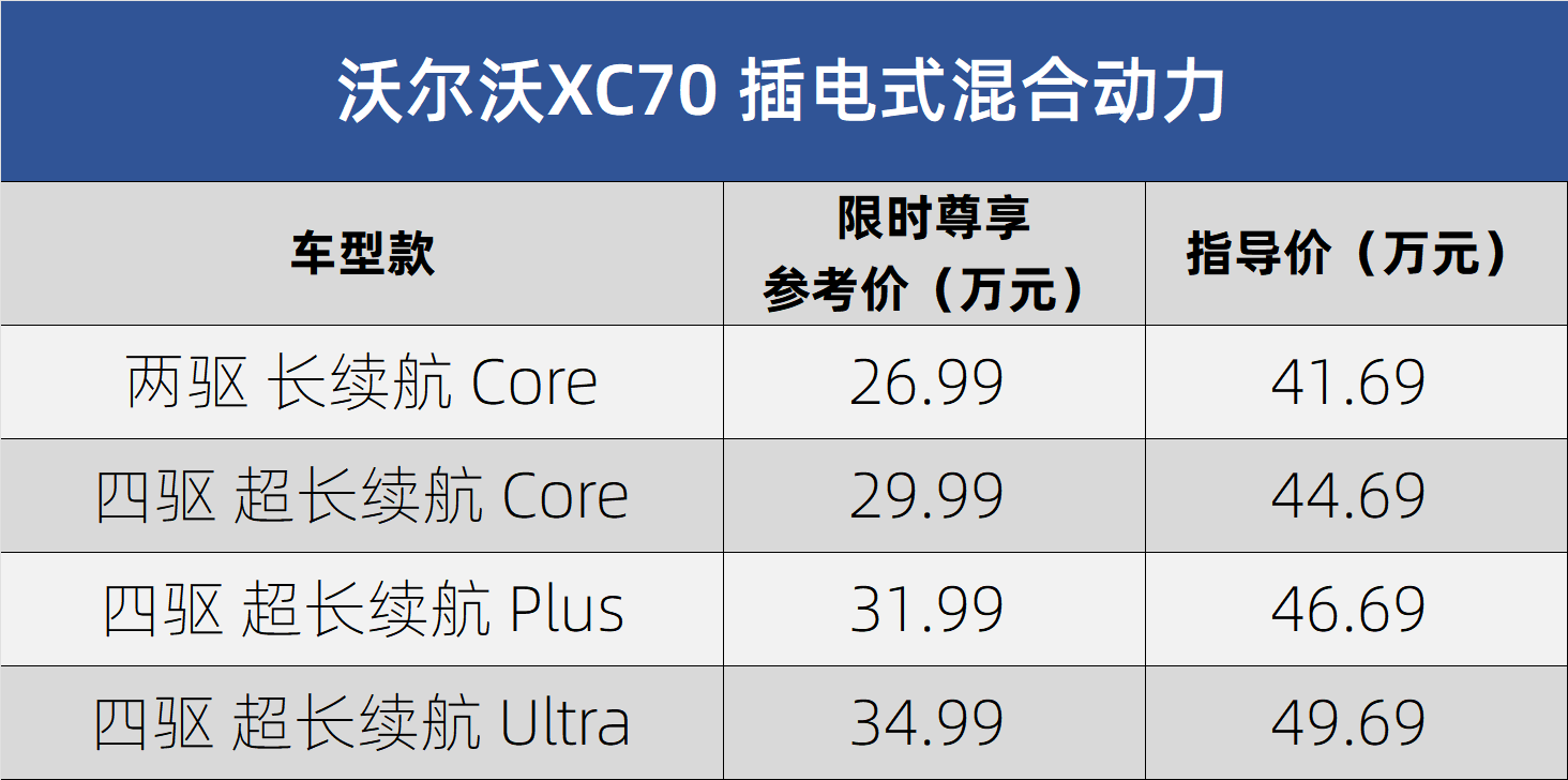 沃爾沃全新XC70插電式混合動力車型正式登陸市場,推出四款配置版本,限時優惠價區間為26.99萬元至34.99萬元,較原指導價41.69萬元至49.69萬元大幅下調。作為首款基于SMA混動架構打造的車型,新車搭載1.5T混動專用發動機、3DHT變速箱及P1+P2+P4三電機系統,CLTC工況下純電續航突破200公里,綜合續航里程超過1200公里。