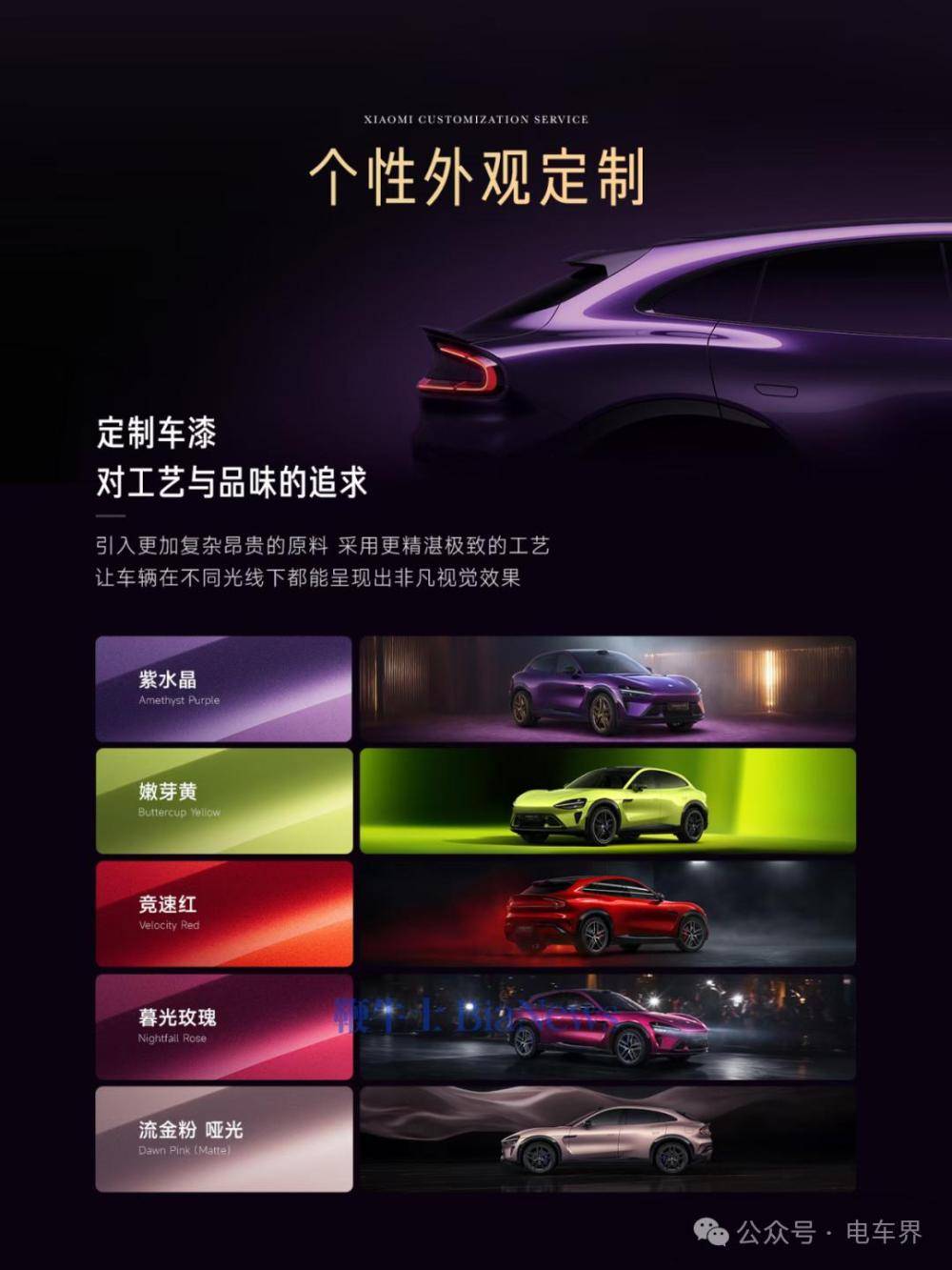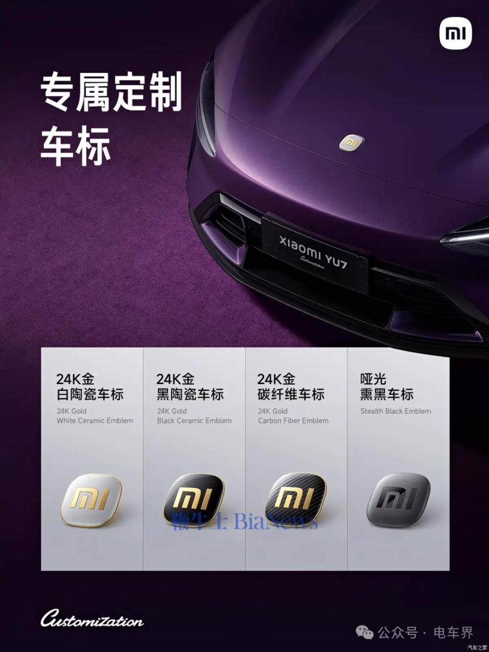 在外觀設計方面,YU7首批推出五款專屬車漆,包括紫水晶、競速紅、暮光玫瑰等獨特配色,其中流金粉啞光與嫩芽黃兩款啞光質感車漆尤為亮眼。小米規劃三年內將定制色庫擴充至100種,構建豐富的色彩選擇體系。除車漆外,用戶還可定制輪轂樣式、布雷博剎車卡鉗顏色,以及四種材質的車標選項——24K金白陶瓷、24K金黑陶瓷、24K金碳纖維及啞光熏黑,打造專屬身份標識。