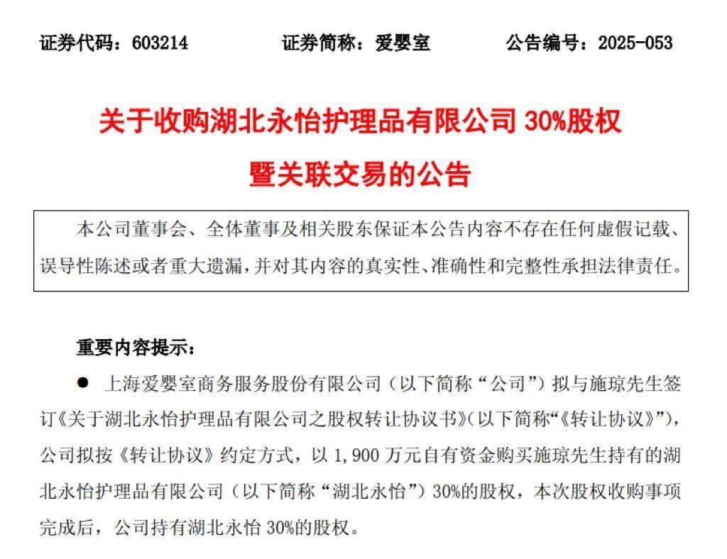 上海愛(ài)嬰室商務(wù)服務(wù)股份有限公司(以下簡(jiǎn)稱(chēng)“愛(ài)嬰室”)近日宣布,將以1900萬(wàn)元收購(gòu)湖北永怡護(hù)理品有限公司(以下簡(jiǎn)稱(chēng)“湖北永怡”)30%的股權(quán)。此次戰(zhàn)略投資旨在強(qiáng)化母嬰產(chǎn)業(yè)鏈布局,深化自有品牌業(yè)務(wù)發(fā)展。