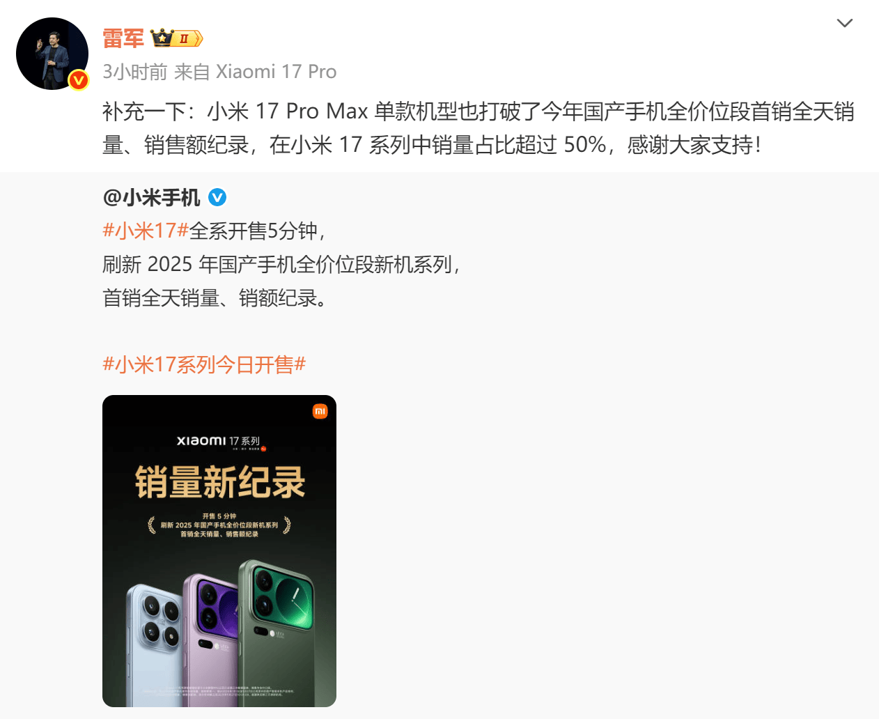 在小米17系列中,小米17 Pro Max表現尤為突出。雷軍透露,該款機型不僅打破了2025年國產手機全價位段首銷全天的銷量紀錄,更刷新了銷售額紀錄。小米17 Pro Max在小米17全系中的銷量占比超過50%,成為該系列當之無愧的“銷量擔當”。