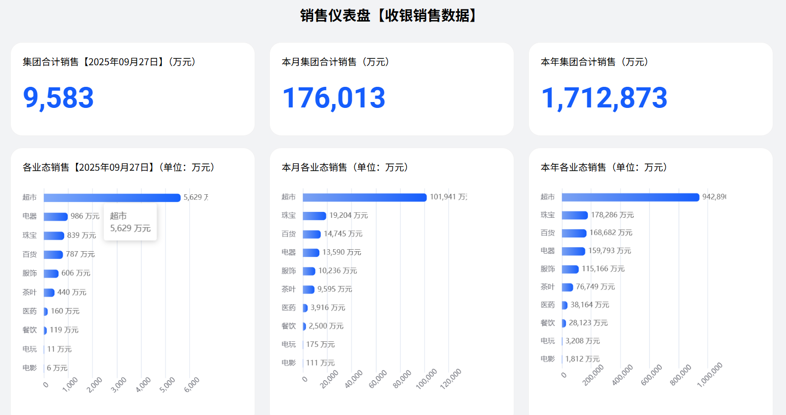 從業務板塊來看,超市業態以94.2億元的銷售額穩居首位,珠寶類與百貨類分別以17.8億元和16.8億元位列第二、第三。電器與服裝業態也表現出色,五大核心業務本月銷售額均突破億元大關,顯示出多業態協同發展的良好態勢。