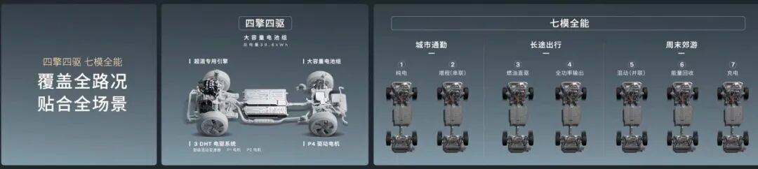 智能交互系統(tǒng)由15.4英寸中控屏、12.3英寸液晶儀表與92英寸AR-HUD組成三屏聯(lián)動,實現(xiàn)導航、車速等核心信息的全場景覆蓋。動力系統(tǒng)搭載1.5T混動專用發(fā)動機,配合熱效率超44%的技術,與3檔混動變速箱形成高效協(xié)作。P1+P2+P4三電機架構可輸出最大功率:P1電機(60kW)負責發(fā)電與動力輔助,前P2電機(107kW)驅動前輪并實現(xiàn)動能回收,后P4電機(156kW)構成智能四驅系統(tǒng)。這種油電雙能源模式支持純電、混動等多種駕駛模式切換,綜合續(xù)航里程突破1200公里。