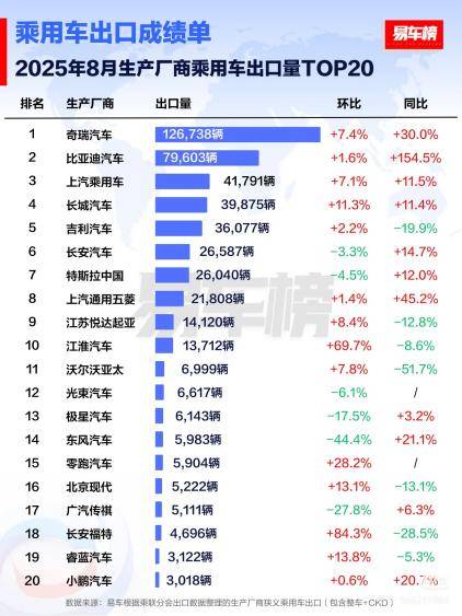 權(quán)威汽車媒體易車最新發(fā)布的出口數(shù)據(jù)顯示,比亞迪在乘用車出口領(lǐng)域表現(xiàn)亮眼。今年8月,比亞迪以79603輛的乘用車出口量位居生產(chǎn)廠商排名第二,同比增幅達(dá)154.5%,增速位列所有廠商之首。今年1-8月,其累計出口量攀升至601065輛,其中明星車型宋PLUS新能源以166699輛的銷量穩(wěn)居車型出口榜首位,展現(xiàn)出強(qiáng)勁的國際市場競爭力。