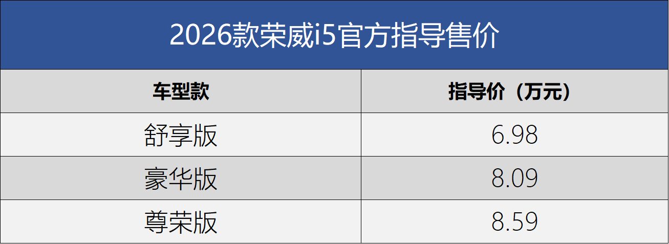 2026款榮威i5近日正式登陸市場,共推出三款不同配置車型,官方指導價區間為6.98萬元至8.59萬元。作為年度改款版本,新車在延續現有動力系統的基礎上,主要針對配置細節進行優化升級,車身尺寸與外觀設計保持原有水準。