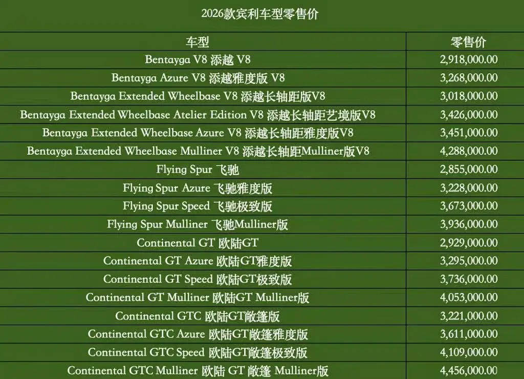 近日,豪華汽車品牌賓利宣布旗下2026款車型正式登陸市場,涵蓋添越、飛馳及歐陸GT三大車系。其中,新款添越推出6款配置,售價區間為291.8萬元至428.8萬元;新款飛馳提供4款車型,售價區間285.5萬元至393.6萬元;新款歐陸GT則有8款車型可選,售價區間292.9萬元至445.6萬元。