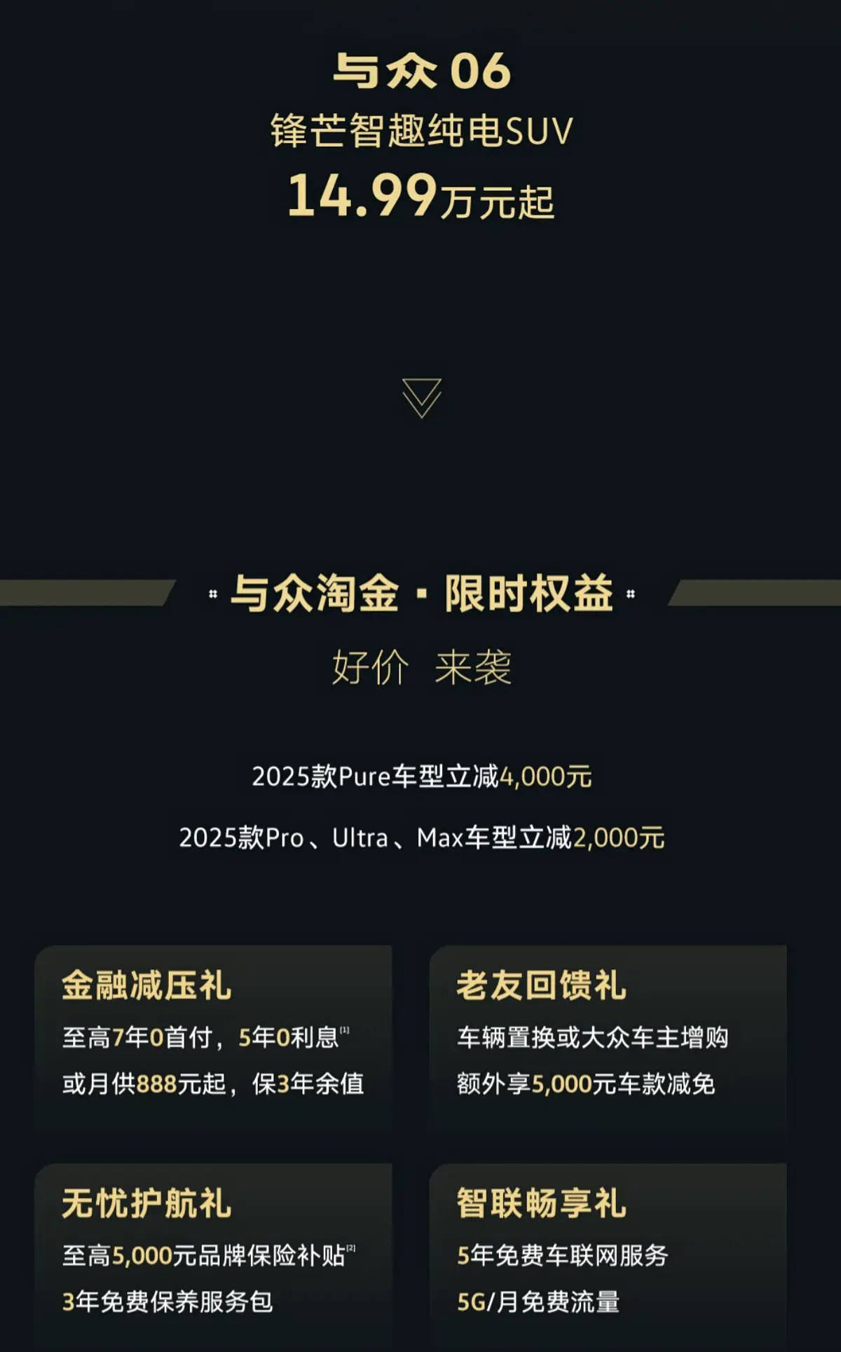 2025款與眾06純電緊湊型SUV近日推出限時購車權益,新車起售價降至14.99萬元,并提供2000元至4000元不等的現金優惠。此次促銷活動同步推出金融減壓禮、老友回饋禮、無憂護航禮及智聯暢享禮四大權益,有效期持續至2025年10月12日。作為今年4月上市的年度改款車型,該車官方指導價區間為18.99萬-24.99萬元。