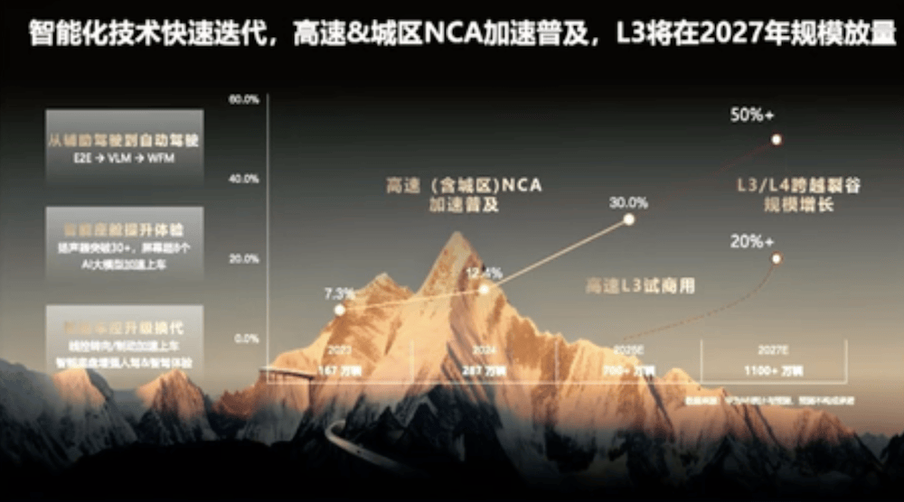 根據華為制定的技術路線圖,自動駕駛商業化將呈現階梯式推進特征。2025年計劃實現高速公路場景L3級自動駕駛試點運營,同步啟動城市道路L4級技術測試;至2026年,高速公路L3將進入規模化商用階段,城市道路L4開啟試點運營;2027年將成為關鍵轉折點,L3級自動駕駛實現大規模市場滲透,城市道路L4正式進入商用階段,同時無人駕駛出租車和干線物流運輸將同步實現商業化落地。