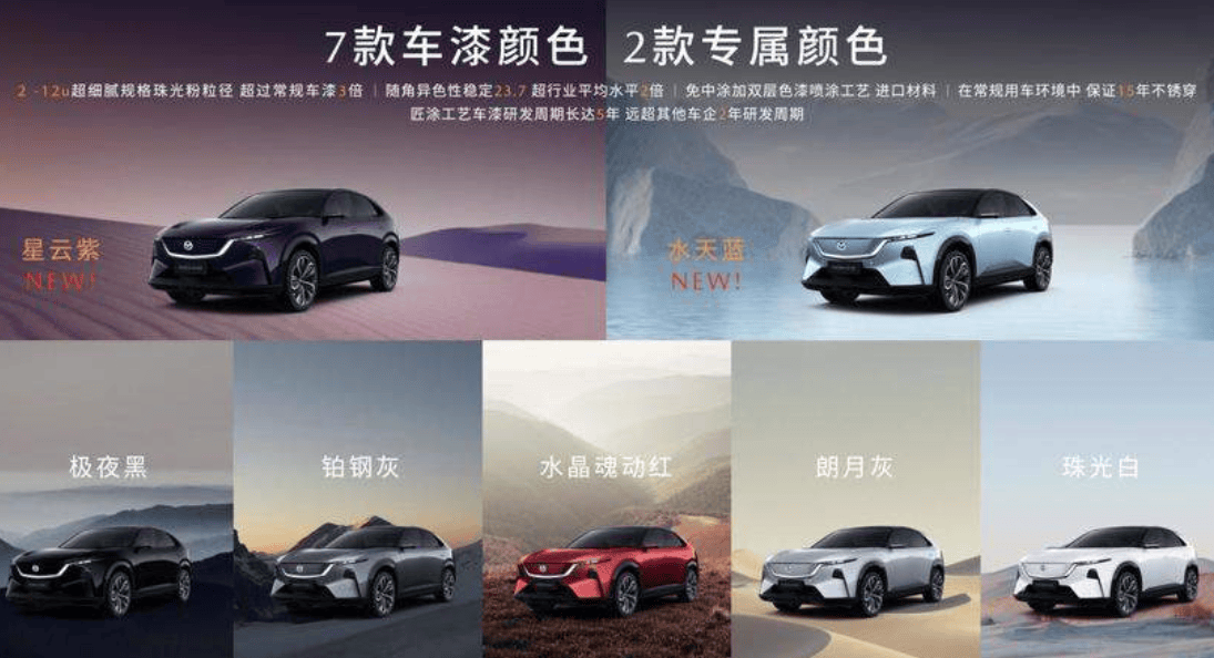 在新能源車型同質化嚴重的背景下,EZ-60以馬自達“魂動”美學為核心,通過百萬級精工曲面設計、雙色懸浮車頂及專屬車漆打造獨特視覺體驗。其中,“星云紫”與“水天藍”兩款車漆采用2-12μm超細膩珠光顆粒,隨角異色性達23.7,通過“濕碰濕”三層噴涂工藝實現30年抗腐蝕性能(鹽霧測試960小時無銹蝕)。車內搭載的26.45英寸5K一體式大屏采用32:9畫幅比例,分辨率達同級最佳,灰態亮度小于0.5nit,并經過-40℃至95℃循環沖擊測試及1000小時常溫穩定性驗證,搭配大視角補償膜技術確保觀感。