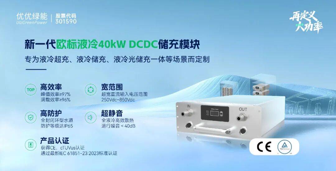 針對高防護、高可靠場景需求,優優綠能于2025年推出基于第二代液冷技術的40kW歐標液冷DC/DC儲充模塊。該模塊與40kW液冷AC/DC模塊尺寸一致,支持靈活部署,可降低系統結構成本。其IP65防護等級可適應惡劣環境,滿足高質量大功率儲充場景需求。公司通過優化模塊設計,使AC/DC與DC/DC模塊效率分別達到97%峰值效率和96%滿載效率,進一步降低電損耗。