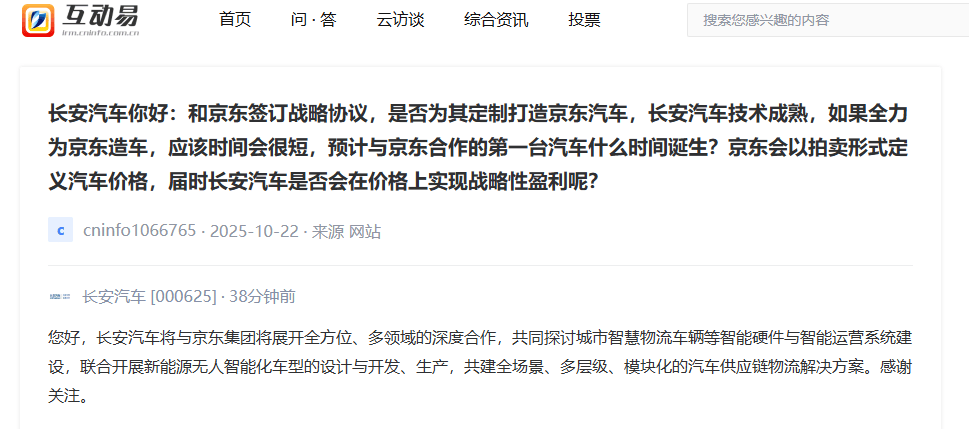 近日,長安汽車在投資者互動平臺上正式宣布,將與京東集團建立全面戰略合作關系,雙方將在智能物流、新能源車輛研發及供應鏈優化等多個領域展開深度協同。