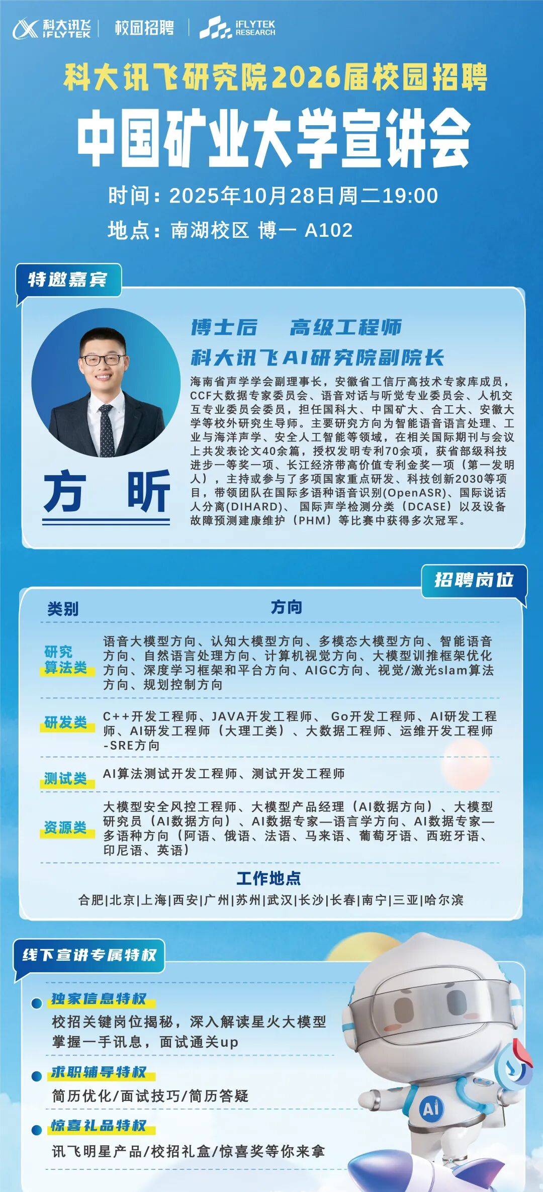 本次宣講會定于10月28日晚19時在博一教學樓A102教室舉行。作為人工智能領域的領軍企業,科大訊飛此次招聘將聚焦技術研發、產品管理等核心崗位,為優秀人才提供具有競爭力的職業發展平臺。