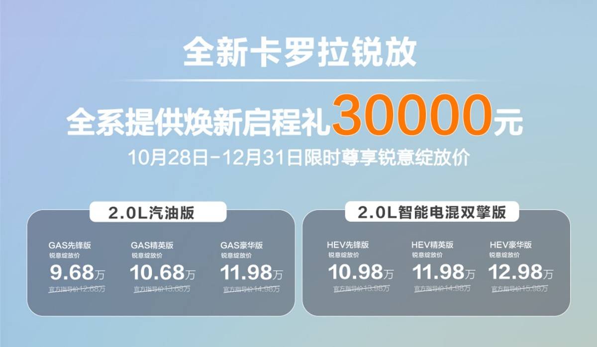 一汽豐田近日推出卡羅拉家族全新成員——卡羅拉銳放,共提供6款配置車型,涵蓋2.0L汽油版與2.0L智能電混雙擎版兩種動力選擇。新車官方指導價區間為12.68萬至15.98萬元,同步推出限時“銳意綻放價”活動,最低售價下探至9.68萬元。