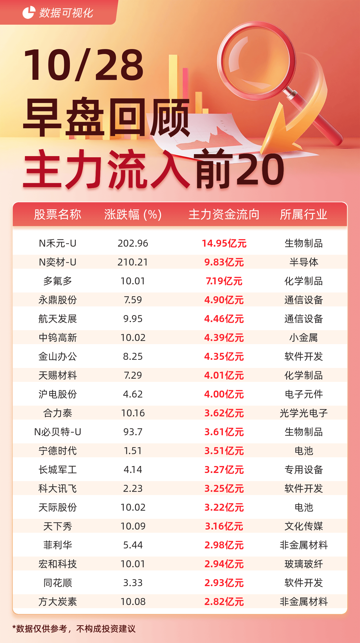 根據(jù)證券交易平臺(tái)最新披露的數(shù)據(jù),10月28日午間市場資金流向呈現(xiàn)顯著分化特征。以N禾元U、N奕材U為代表的新上市標(biāo)的成為資金追逐焦點(diǎn),其中N禾元U單日凈流入額達(dá)14.95億元,以絕對優(yōu)勢領(lǐng)跑資金流入榜。緊隨其后的N奕材U獲得9.83億元資金加持,兩家新股合計(jì)吸引近25億元主力資金入場。