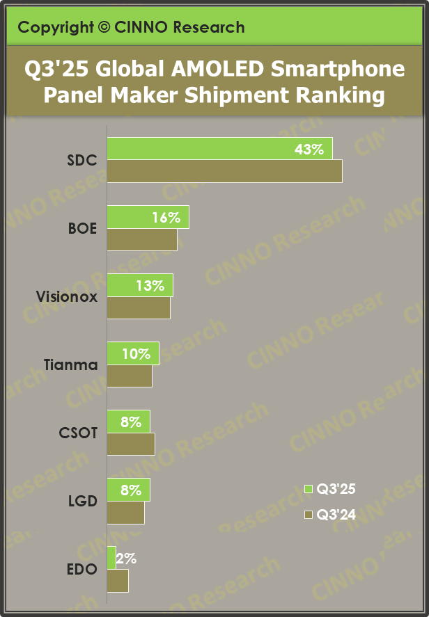 根據CINNO Research統計數據顯示,2025年第三季度全球AMOLED智能手機面板出貨量約2.5億片,同比增長11.7%,環比增長20.3%,實現同比與環比雙增長,市場景氣度持續回升。國內面板廠商維信諾(002387)三季度出貨量同比增長16.7%,出貨量排名位居全球第三。