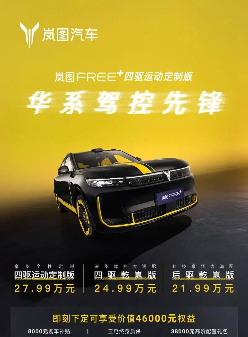近日,嵐圖汽車正式對外發(fā)布了FREE+四驅(qū)運動定制版的官方圖片,同時宣布該車型售價為27.99萬元。為了回饋消費者,品牌方還推出限時下定優(yōu)惠活動,即刻下單可享受總價值高達46000元的購車權(quán)益,其中包括8000元的購車補貼、三電系統(tǒng)終身質(zhì)保服務(wù),以及價值38000元的高階配置升級禮包。