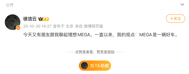 小米高管徐潔云發(fā)聲:理想MEGA設(shè)計(jì)獨(dú)特,超大空間便捷補(bǔ)能是好車