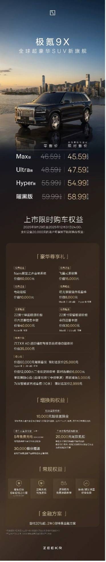 即日起,用戶可通過極氪App、官網(wǎng)、小程序及全國極氪門店預(yù)定極氪9X。2025年9月29日至12月31日期間支付2萬元定金的用戶,可享免費(fèi)贈(zèng)送Naim音響、飛翼式滑移屏、電動(dòng)踏板等價(jià)值超20萬元的限時(shí)權(quán)益,疊加1萬元超級(jí)置換金及品牌車主專屬福利。極氪9X與極氪009組成“雙旗艦”布局,以技術(shù)突破與體驗(yàn)升級(jí),開啟中國豪華旗艦SUV的新時(shí)代。