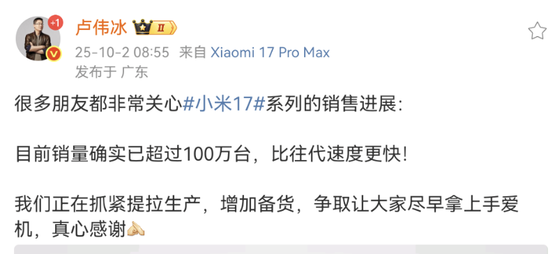 小米公司近日迎來喜訊,其最新旗艦機型小米17系列市場表現亮眼。據小米集團合伙人、總裁盧偉冰在社交平臺發布的消息,該系列自上市以來銷量持續攀升,目前已突破百萬臺大關。