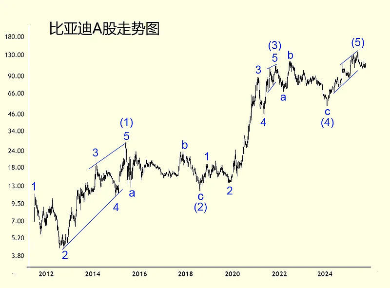 以比亞迪為例,其股價走勢與S型曲線理論密切相關(guān)。根據(jù)波浪理論分析,比亞迪H股第[5]浪可能已于今年5月結(jié)束。具體來看,第[5]浪內(nèi)部結(jié)構(gòu)為楔形,由5個3浪結(jié)構(gòu)的子浪組成。比亞迪A股方面,第(5)浪同樣以楔形形態(tài)于今年5月見頂。假設投資者在2020年5月以約17元的價格買入比亞迪A股,截至9月25日收盤價107.5元,理論上可獲利5.3倍,完美實踐了S型曲線投資法。