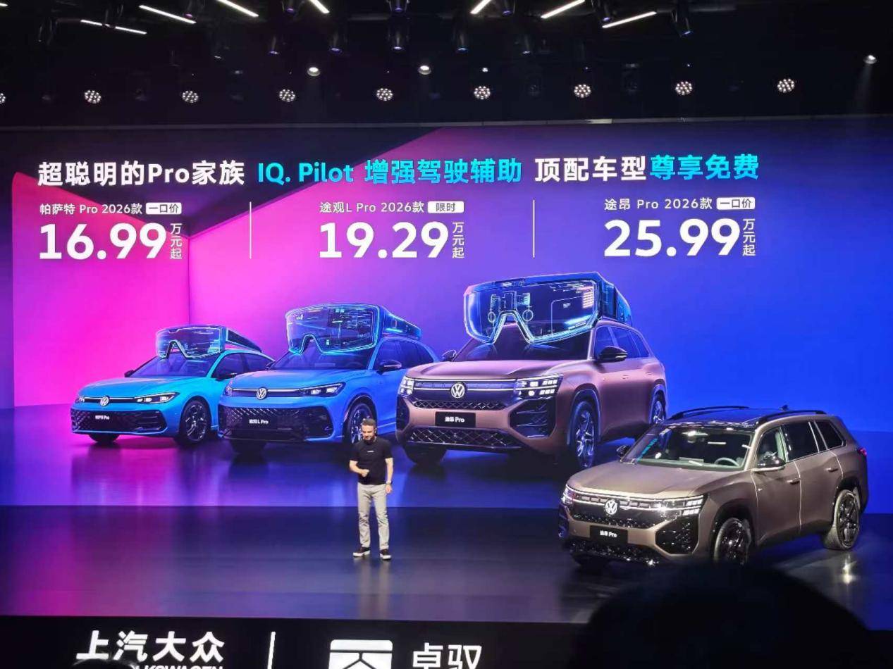 上市發布會現場,上汽大眾正式推出2026款Pro家族三款車型,價格策略引發市場關注。途觀L Pro起售價19.29萬元,帕薩特Pro以16.99萬元刷新合資中高級轎車智能配置門檻,途昂Pro則定位25.99萬元起。技術普惠成為最大亮點:IQ.Pilot系統在頂配車型實現標準配置,其他版本僅需5000元選裝費,較行業平均水平降低60%。智能座艙領域,百度文心與DeepSeek雙大模型的深度整合帶來革命性交互體驗,語音系統可同時解析五個指令,Face ID技術實現座椅、后視鏡、空調等設置的個性化自動調節。