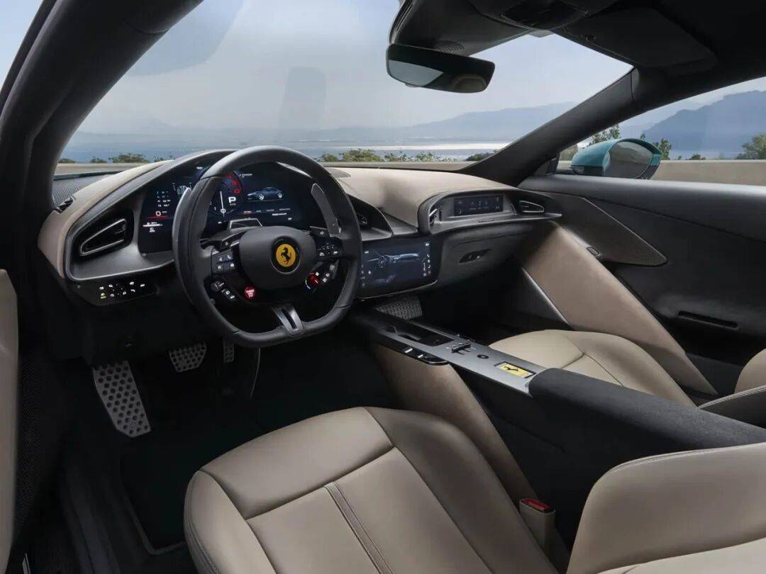 內飾延續法拉利標志性的雙座艙布局,方向盤設計融合實體按鍵與經典紅色啟動按鈕,強調駕駛儀式感。中控臺采用集成式三屏系統:15.6英寸數字儀表盤實時顯示車輛動態;10.25英寸中央觸控屏支持多媒體、空調、座椅調節等功能,并兼容CarPlay與無線充電;8.8英寸乘客屏可展示G值、轉速等數據,讓乘客同步感受駕駛激情。