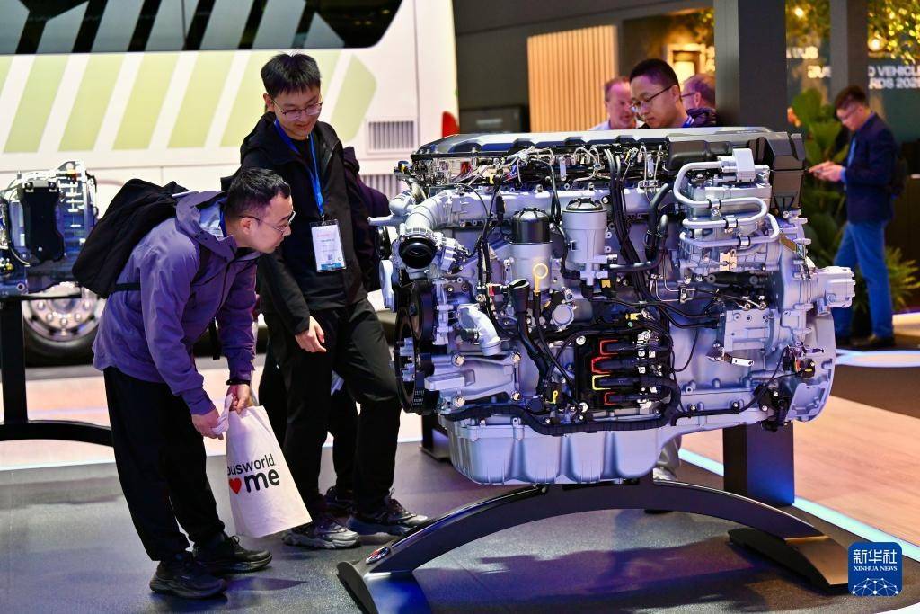 在曼恩展臺前,參觀者絡繹不絕。這家德國商用車巨頭帶來的多款新型客車引發專業觀眾濃厚興趣,技術人員正就車輛性能參數與來訪者深入交流。不遠處,斯堪尼亞展區同樣熱鬧非凡,一款核心動力裝置展品吸引眾多目光,參觀者駐足細觀其精密構造。