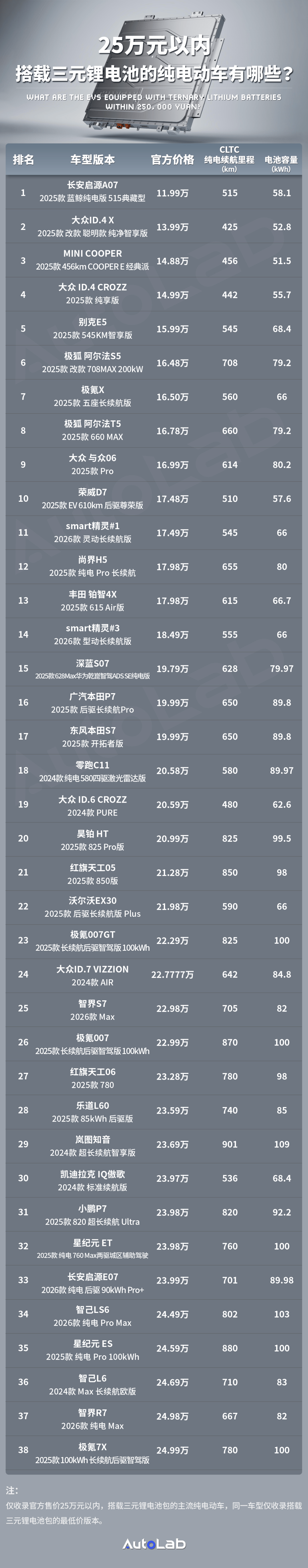 今天,我們就從三元鋰電池的角度出發(fā),為消費者提供一份購車指南。在25萬元以內(nèi)的預算范圍內(nèi),消費者可以找到哪些搭載三元鋰電池的純電動車呢?