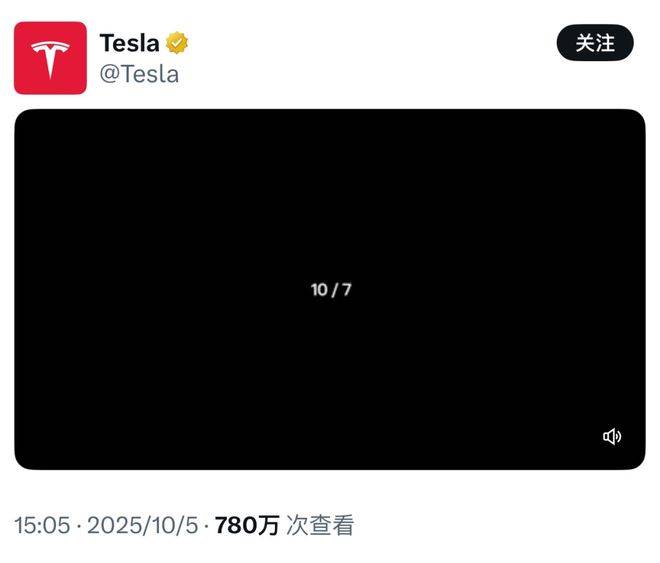 特斯拉官方社交媒體賬號近日動作頻頻,引發市場廣泛關注。10月5日,其X平臺賬號發布一條僅9秒的預熱視頻,畫面中一個帶有特斯拉標志的金屬渦輪部件高速旋轉,最終定格在"10/7"的日期畫面。這條未配任何文字說明的短視頻,瞬間點燃了外界對特斯拉即將發布重大消息的猜測。