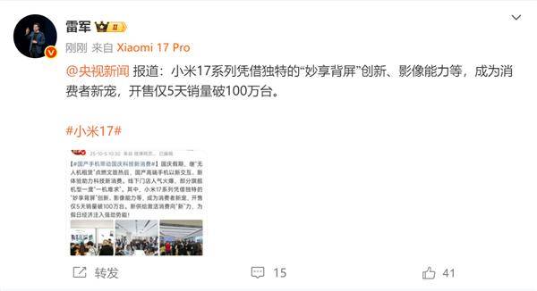 ?雷軍官宣小米17系列5天銷量破百萬,熱門版本缺貨市場反響熱烈?