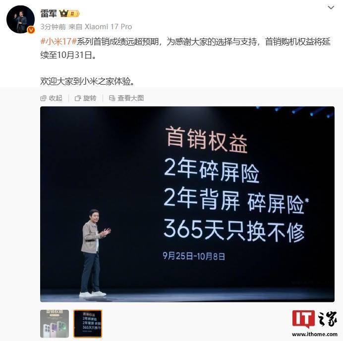 小米17系列手機(jī)自上市以來持續(xù)引發(fā)市場熱潮。據(jù)央視新聞10月5日報道,該系列開售僅5天便實現(xiàn)銷量突破100萬臺,這一數(shù)據(jù)隨后獲得小米創(chuàng)始人雷軍的微博轉(zhuǎn)發(fā)確認(rèn)。雷軍今日通過社交平臺宣布,為回饋消費者支持,首銷購機(jī)專屬權(quán)益將延長至10月31日。