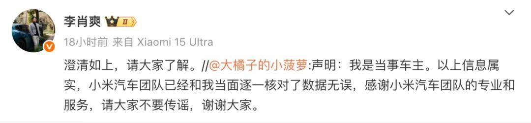 當(dāng)事人車主也在評(píng)論區(qū)發(fā)布聲明,確認(rèn)小米公司發(fā)言人回應(yīng)的信息屬實(shí),小米汽車團(tuán)隊(duì)已與其當(dāng)面逐一核對(duì)數(shù)據(jù)無誤,并對(duì)小米汽車團(tuán)隊(duì)的專業(yè)和服務(wù)表示感謝,同時(shí)呼吁大家不要傳謠。