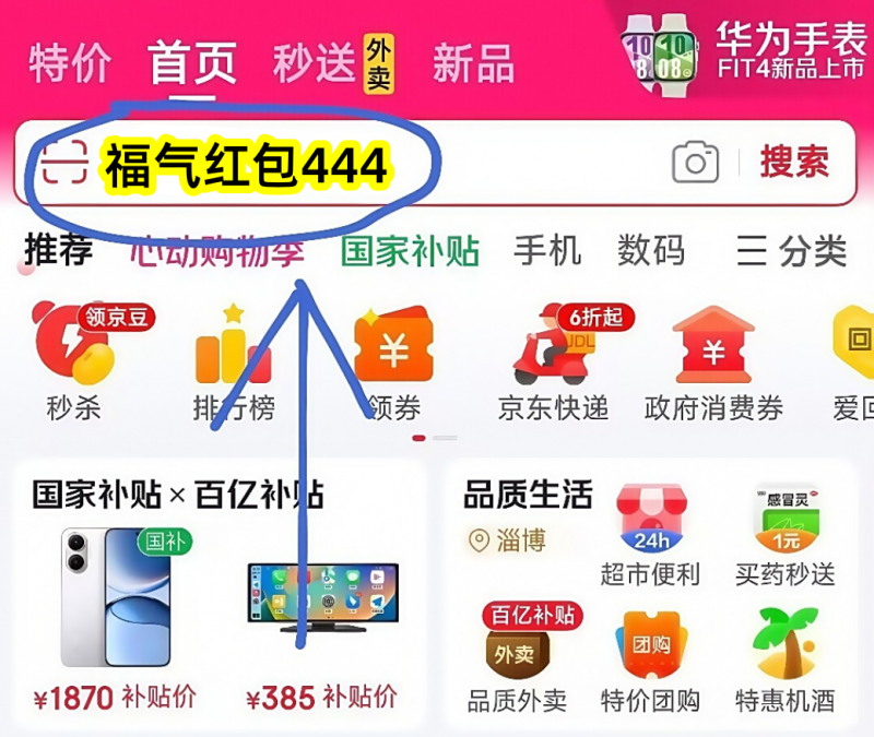 核心通道:打開手機京東APP,在搜索框輸入指定口令即可進入活動頁面。基礎口令為【福氣紅包444】,每天嘗試不同口令可獲取更多優惠機會。
