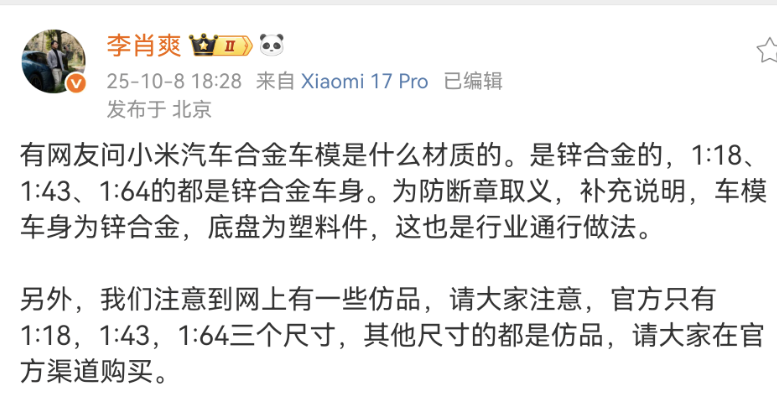 近日,小米汽車(chē)副總裁李肖爽通過(guò)社交媒體平臺(tái)正式回應(yīng)了消費(fèi)者關(guān)于小米汽車(chē)車(chē)模的疑問(wèn)。他明確表示,官方推出的車(chē)模系列均采用鋅合金材質(zhì)打造車(chē)身,底盤(pán)部分則選用塑料材質(zhì),以兼顧質(zhì)感與輕量化設(shè)計(jì)。目前,官方車(chē)模僅提供1:18、1:43和1:64三種比例規(guī)格,其他尺寸或材質(zhì)的產(chǎn)品均非官方授權(quán)。