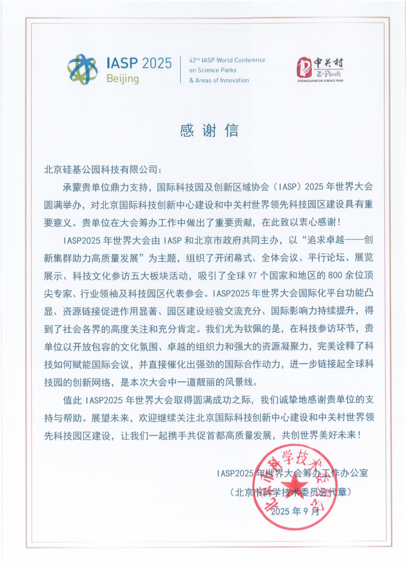 正如IASP在感謝信中所提:“貴單位以開放包容的文化氛圍、卓越的組織力和強(qiáng)大的資源凝聚力,完美詮釋了科技如何賦能國際會議。”這份肯定,既是對過去工作的總結(jié),更是對未來征程的激勵。啟迪之星將繼續(xù)落實(shí)賦能園區(qū)科協(xié)高質(zhì)量發(fā)展項目要求,在北京市科委、市科協(xié)創(chuàng)新服務(wù)中心指導(dǎo)下,深耕創(chuàng)新服務(wù),為更多科技企業(yè)搭建通向世界的橋梁!