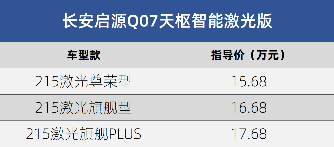 長安啟源Q07近日推出駕駛輔助激光版車型,新車最大亮點在于搭載激光雷達系統,支持更高級別的智能駕駛功能。此次共推出3款配置車型,售價區間為15.68萬元至17.68萬元。除智能駕駛升級外,新車延續了天域座艙、天衡底盤等核心配置,并搭載天域OS操作系統。