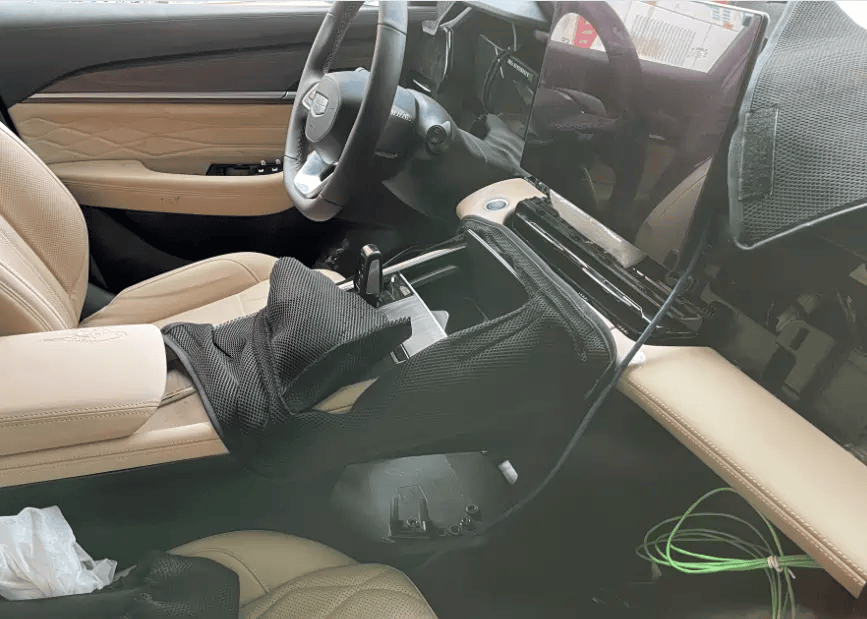 內飾是此次改款的重點區域。現款車型的雙聯屏設計被取消,取而代之的是一塊獨立的大尺寸中控屏。不過,這塊屏幕的安裝位置較高,部分觀察者認為其可能影響駕駛視野,且整體視覺效果略顯突兀。中央空調出風口位置進行了重新布局,下方實體按鍵被大幅精簡,內飾風格更趨簡潔。換擋機構改為小巧精致的電子擋把,進一步提升了車內科技感。需注意的是,當前曝光車型為試裝版本,最終量產版可能存在差異。