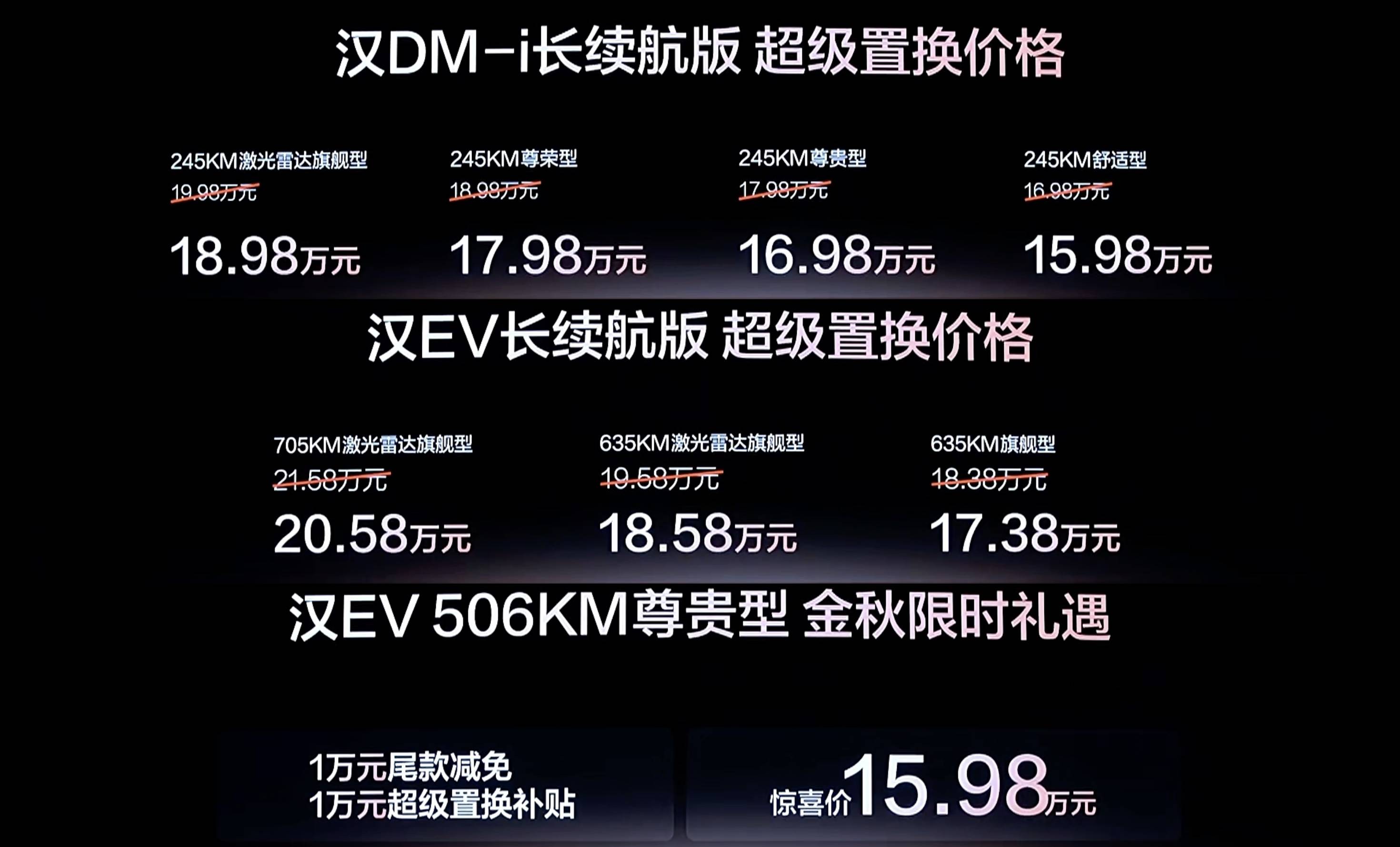 比亞迪漢長(zhǎng)續(xù)航版正式登場(chǎng),此次共推出DM-i與EV兩大系列車型,為消費(fèi)者帶來更多元化的選擇。其中,DM-i長(zhǎng)續(xù)航版一次性推出四款配置,售價(jià)區(qū)間鎖定在16.98萬(wàn)元至19.98萬(wàn)元之間;EV長(zhǎng)續(xù)航版則提供三款車型,售價(jià)區(qū)間為18.38萬(wàn)元至21.58萬(wàn)元。更令人心動(dòng)的是,所有車型均享有1萬(wàn)元的置換補(bǔ)貼優(yōu)惠,而漢EV 560KM尊貴型更是推出限時(shí)特惠價(jià),僅需15.98萬(wàn)元即可擁有。